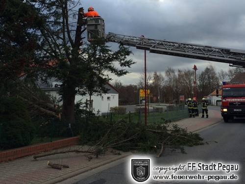 Die Feuerwehr Pegau sowie die Drehleiter aus Groitzsch wurden heute gegen 11 Uhr, zu einem umgestürzten Baum nach Pegau alarmiert. In der Carsdorfer Straße ist durch das Sturmtief eine ca. 10 Meter hohe Konifere umgekippt. Eine weitere Konifere verlor dadurch seine Stabilität und drohte auf Gehweg und Fahrbahn zu stürzen. Die 12 ausgerückten Kameraden aus Pegau und Groitzsch trugen von der Drehleiter aus den Baum Sstück für Stück ab. Nach rund 90 Minuten konnte die Einsatzstelle an den Eigentümer übergeben werden.
